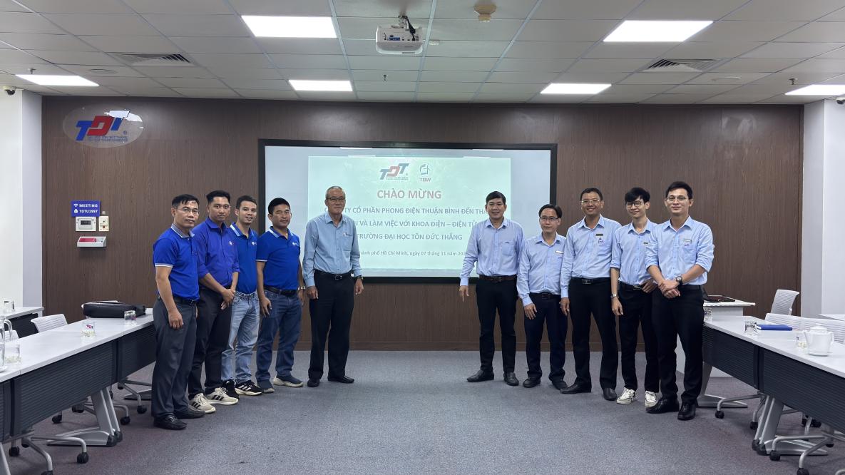 Sáng ngày 07/11/2025, Khoa Điện – Điện tử (Đ-ĐT), Trường Đại học Tôn Đức Thắng đã vinh dự đón tiếp Công ty Cổ phần Phong Điện Thuận Bình đến tham quan và làm việc tại Trường. Buổi gặp gỡ có sự hiện diện của TS. Huỳnh Văn Vạn – Phó Trưởng Khoa, TS. Trần Đình Cương – Phó Trưởng Bộ môn cùng các giảng viên Bộ môn Kỹ thuật Điện. Về phía doanh nghiệp, đoàn công tác do Ông Bùi Văn Thịnh – Tổng Giám đốc dẫn đầu, cùng ông Lê Minh Thạch – Phó Tổng Giám đốc, ông Phạm Quang Triệu – Giám đốc Trung tâm Dịch vụ M&E và các cộng sự. Chương trình diễn ra trong không khí thân mật, cởi mở, thể hiện tinh thần hợp tác giữa nhà trường và doanh nghiệp trong lĩnh vực đào tạo và phát triển nguồn nhân lực.