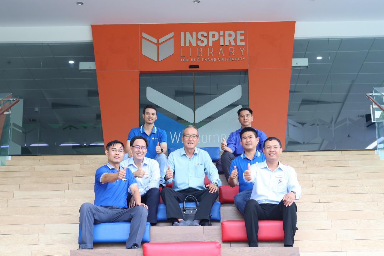Khoảnh khắc lưu niệm của đại diện Khoa Điện - Điện tử, Trường Đại học Tôn Đức Thắng và đoàn Công ty Phong Điện Thuận Bình tại Thư viện.