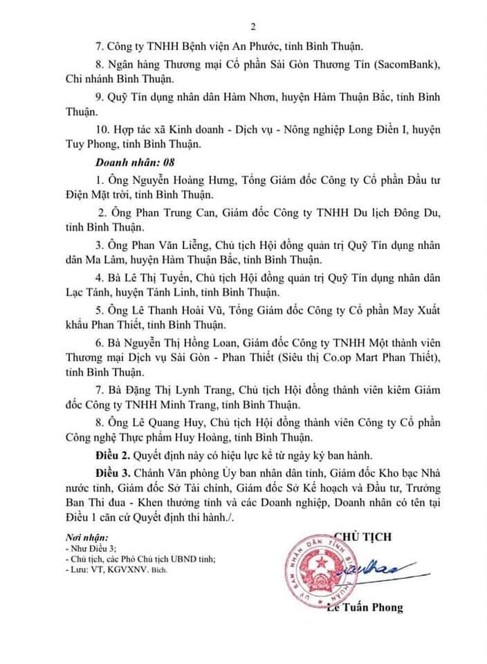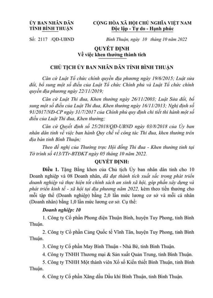Ngày 13/10/2022, Công ty Cổ phần Phong điện Thuận Bình vinh dự nhận Bằng khen của Chủ tịch UBND tỉnh Bình Thuận ở hạng mục Doanh nghiệp đã đạt thành tích xuất sắc trong phát triển doanh nghiệp và thực hiện tốt chính sách an sinh xã hội, góp phần xây dựng và phát triển kinh tế - xã hội tại địa phương năm 2022 theo quyết định khen thưởng số 2117/QĐ-UBND ngày 10/10/2022